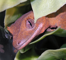 Crested Geckos thrive at temperatures between 65 and 80 degrees, room temperature in many homes, thus making supplemental heating unnecessary. They do not generally require expensive UVB lighting like some other species since they are nocturnal. They will eat a prepared diet called aptly enough "The Crested Gecko Diet" which is produced by Allen Repashy in addition to mashed fruits/baby food with dusted (with calcium) crickets and other small insects.