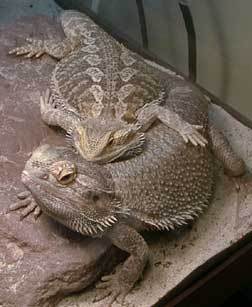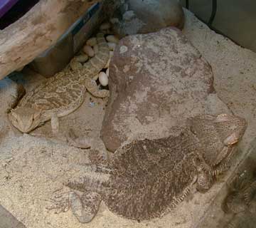 When the light and the heat would go off they would flop wherever and sleep all night. It is almost like flipping a switch. Instant sleep. They generally had sand on the bottom for a substrate. I have never seen them eat any, (I hand fed both of them most of the time) but be careful. If you see yours gulping sand down while diving for crickets get rid of it and use something else. For some time now Bisquik has lived with some of her "girlfriends" in a this tank. Eddie was single for some time before his passing. I leave the story here as it is a good illustration of how to keep a couple of dragons.
